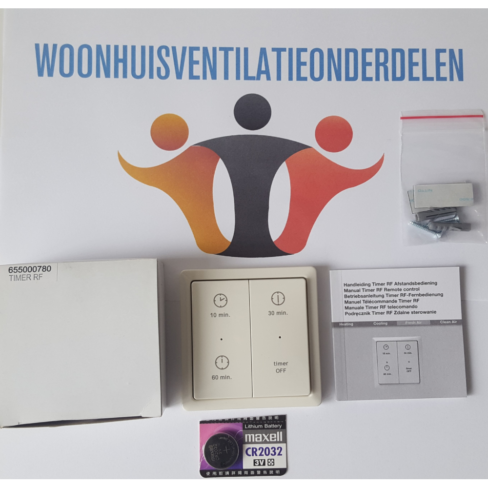 Losse Timer RF voor Stork woonhuisventilatoren met een radiografische ontvanger zoals de ComfoFan SR, SRP en S CO2. Op deze ventilatoren kunnen 31 sensoren en bedieningen worden geschakeld.Met de Timer RF is het mogelijk de ventilatie handmatig 10, 30 of 60 minuten op maximaal te zetten. Met de `Timer OFF` wordt de tijdelijke ventilatie in de hoogste stand beëindigd. De ventilatie-unit zal terugkeren naar de laatst gekozen ventilatiestand op de bedieningseenheid.Belangrijke kenmerken:Activeert tijdelijk de hoogste ventilatiestandGeen bekabeling tussen schakelaar en unitWerkt op batterijEenvoudig aan wand te monteren (plakken,schroeven)De behuizing is wit, RAL 9010.